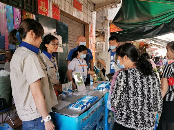 (圖為柳州鹽業(yè)有限公司職工利用周末時(shí)間到菜市場(chǎng)推廣新品海鹽)