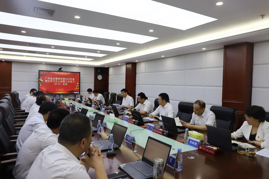 2022年5月27日上午,廣西鹽業(yè)集團黨委召開理論學習中心組2022年第三次學習(擴大)會議,學習研討習近平新時代中國特色社會主義思想的基本精神、基本內(nèi)容、基本要求,以及習近平總書記關(guān)于社會主義市場經(jīng)濟條件下發(fā)揮資本積極作用和關(guān)于全過程人民民主的重要論述等學習材料。廣西鹽業(yè)集團黨委書記、董事長李奕添主持會議,鹽業(yè)集團總部各部門負責人、中鹽廣西鹽業(yè)有限公司部門負責人和北部灣鹽業(yè)科技有限公司負責人列席會議。