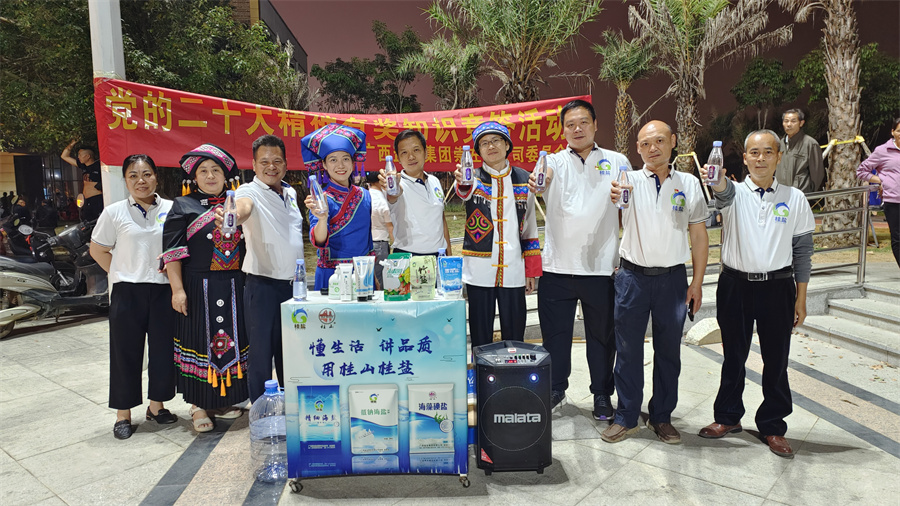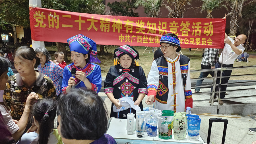 活動現(xiàn)場,黨員們以黨的二十大精神和民族理論政策知識為切入點,結(jié)合公司新上市的桂鹽牌雪花鹽和竹鹽產(chǎn)品、日化用鹽產(chǎn)品和仫佬山泉飲用水等開展宣傳推廣,在加深市民群眾對黨的二十大精神、民族團(tuán)結(jié)政策的認(rèn)識,進(jìn)一步增強(qiáng)對中華民族的認(rèn)同感、歸屬感和自豪感的同時,也把“吃好鹽 吃海鹽,認(rèn)準(zhǔn)廣西鹽業(yè)的“桂鹽”系列海鹽”的理念根植于民眾心中。知識競賽環(huán)節(jié)以“桂鹽”牌海鹽為獎品,極大激發(fā)了民眾的參與熱情,大家相互詢問、積極搜尋答案,互動熱情高漲,活動氛圍熱烈濃厚。