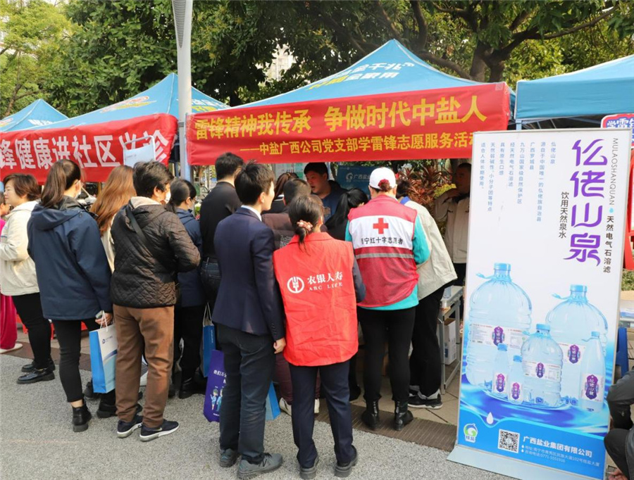 在第60個“學(xué)雷鋒紀(jì)念日”來臨之際,為進(jìn)一步弘揚“雷鋒精神”,突出科學(xué)認(rèn)識補碘和健康用鹽的重要性,加大市民群眾對廣西鹽業(yè)集團“桂山”“桂鹽”品牌的認(rèn)知度,進(jìn)一步深化和鞏固“守護小鹽罐 守護大民生 ”我為群眾辦實事實踐活動的工作成效,3月2日上午,中鹽廣西有限公司黨支部、廣西鹽業(yè)集團總部黨支部聯(lián)合金浦社區(qū)黨委,在金浦社區(qū)都市假期廣場開展“雷鋒精神我傳承 爭做時代中鹽人”學(xué)雷鋒志愿服務(wù)活動。