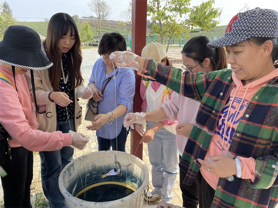 品茶結(jié)束后,大家還體驗(yàn)了手工扎染,疊、扎、浸、晾……在老師的講解下,女職工們發(fā)揮想象與智慧,靜下心來用靈巧的雙手、塑造著自己的作品。不知不覺間,每個人手中的白布變得色彩斑斕,絕美的藝術(shù)感讓大家嘖嘖稱奇,親身體驗(yàn)到了扎染藝術(shù)變化莫測的魅力。