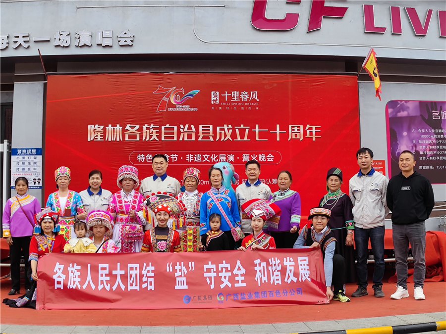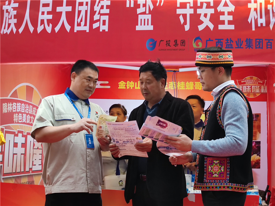 3月28日是隆林各族自治縣成立70周年縣慶,百色分公司黨支部書記林靜帶領市場推廣宣導隊暨黨員先鋒隊隊員在隆林民俗文化交流中心美食城與各產(chǎn)業(yè)企業(yè)聯(lián)合開展民族政策和產(chǎn)品推介宣傳活動。在活動現(xiàn)場,宣導隊開展食鹽安全及科學用鹽等知識的咨詢,與群眾進行安全用鹽知識問答互動,為群眾科學用鹽支招,現(xiàn)場各族群眾爭相搶答家用“桂鹽”的感受,融合氣氛熱情高漲、和美與共,促進了各民族群眾彼此間的了解和友誼。