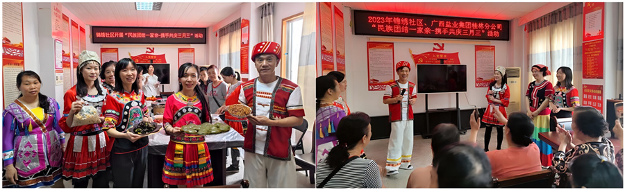 廣西鹽業(yè)集團(tuán)桂林分公司攜手桂林市錦繡社區(qū)共同開展“民族團(tuán)結(jié)一家親 攜手共慶三月三”主題活動(dòng)。鹽業(yè)集團(tuán)員工與社區(qū)群眾身著各色少數(shù)民族盛裝,共同對(duì)山歌、做繡球、品百家美食,沉浸式體驗(yàn)民俗文化的魅力和風(fēng)采。各族群眾以歌會(huì)友、以歌待客,同慶“壯族三月三”佳節(jié),像一家人一樣親密無(wú)間,傳遞濃濃民族情。