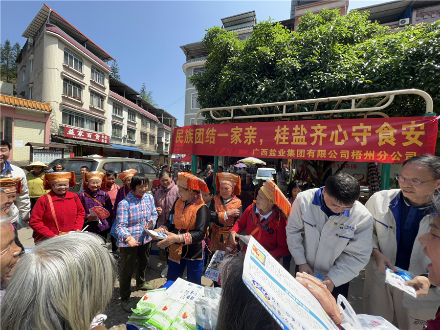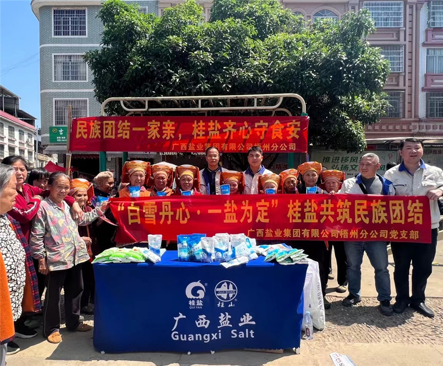 5月8日,為貫徹落實(shí)習(xí)近平總書記關(guān)于加強(qiáng)和改進(jìn)民族工作的重要思想,梧州分公司緊緊圍繞鑄牢中華民族共同體意識這條主線,領(lǐng)導(dǎo)班子帶領(lǐng)公司志愿者來到蒙山縣太坪鎮(zhèn)瑤族鄉(xiāng),組織“民族團(tuán)結(jié)一家親,‘桂鹽’齊心守食安”民族團(tuán)結(jié)攜手共促食鹽安全宣傳活動(dòng)。