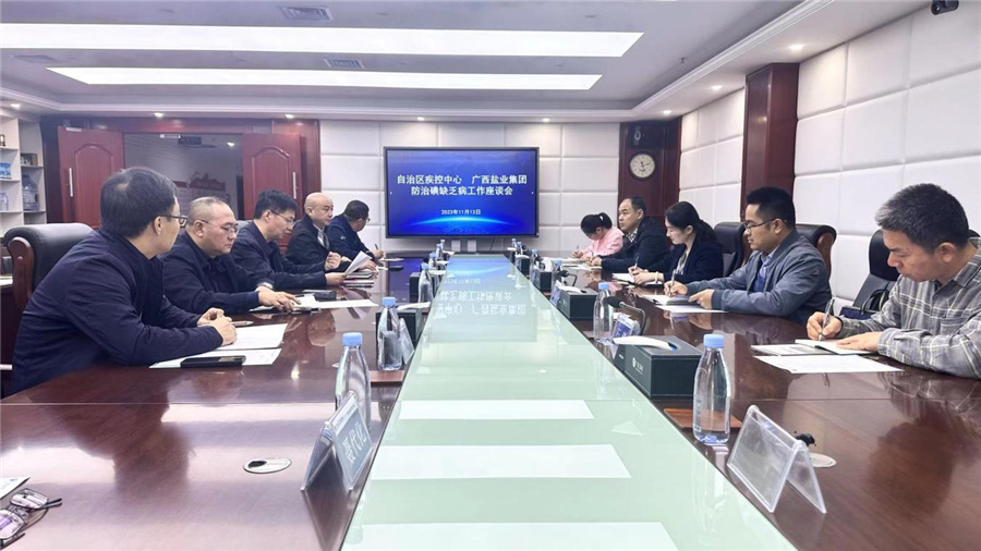 在集團(tuán)公司本部會(huì)議室,雙方圍繞當(dāng)前我區(qū)碘缺乏病防治工作情況及亟待解決的問(wèn)題進(jìn)行了座談交流。黃先紅首先介紹了當(dāng)前廣西食鹽供應(yīng)情況,他表示,廣西鹽業(yè)集團(tuán)有限公司一直以來(lái)都高度重視防治碘缺乏工作,積極貫徹落實(shí)國(guó)家和自治區(qū)的相關(guān)政策,通過(guò)嚴(yán)控供應(yīng)渠道、嚴(yán)守安全底線、嚴(yán)把產(chǎn)品質(zhì)量,確保了廣西地區(qū)食鹽碘含量長(zhǎng)期穩(wěn)定,為預(yù)防碘缺乏病作出了應(yīng)有的貢獻(xiàn),同時(shí)就雙方合作普及碘鹽宣傳、精準(zhǔn)供應(yīng)無(wú)碘鹽、加強(qiáng)指標(biāo)監(jiān)控等方面提出了建議。調(diào)研組對(duì)廣西鹽業(yè)長(zhǎng)期以來(lái)積極履行企業(yè)社會(huì)責(zé)任給予了肯定,為廣西防治碘缺乏病工作作出突出貢獻(xiàn)表示了感謝。期待廣西鹽業(yè)集團(tuán)與全區(qū)各級(jí)疾控中心繼續(xù)深化合作,持續(xù)開(kāi)展科學(xué)補(bǔ)碘聯(lián)合宣傳,共同為廣西碘缺乏病防治工作作出新的貢獻(xiàn)。