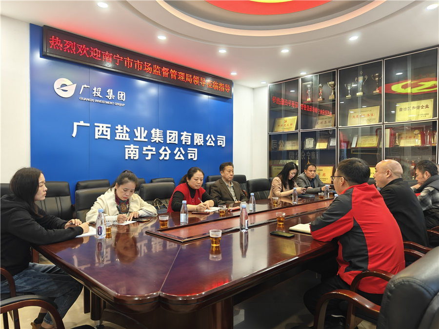 1月8日下午,南寧市市場(chǎng)監(jiān)督管理局黨組成員、三級(jí)調(diào)研員邵惠寧率隊(duì)到廣西鹽業(yè)集團(tuán)南寧分公司調(diào)研,就食鹽科普驛站建設(shè)情況及食鹽市場(chǎng)情況進(jìn)行了實(shí)地查看和座談。