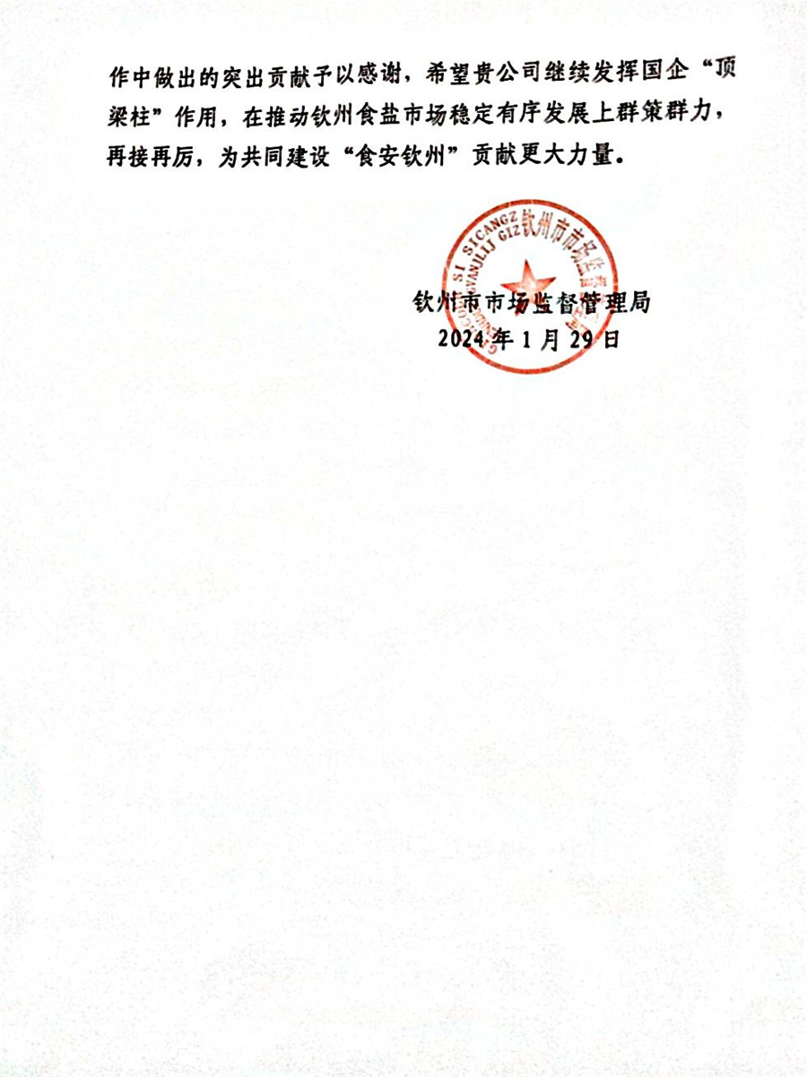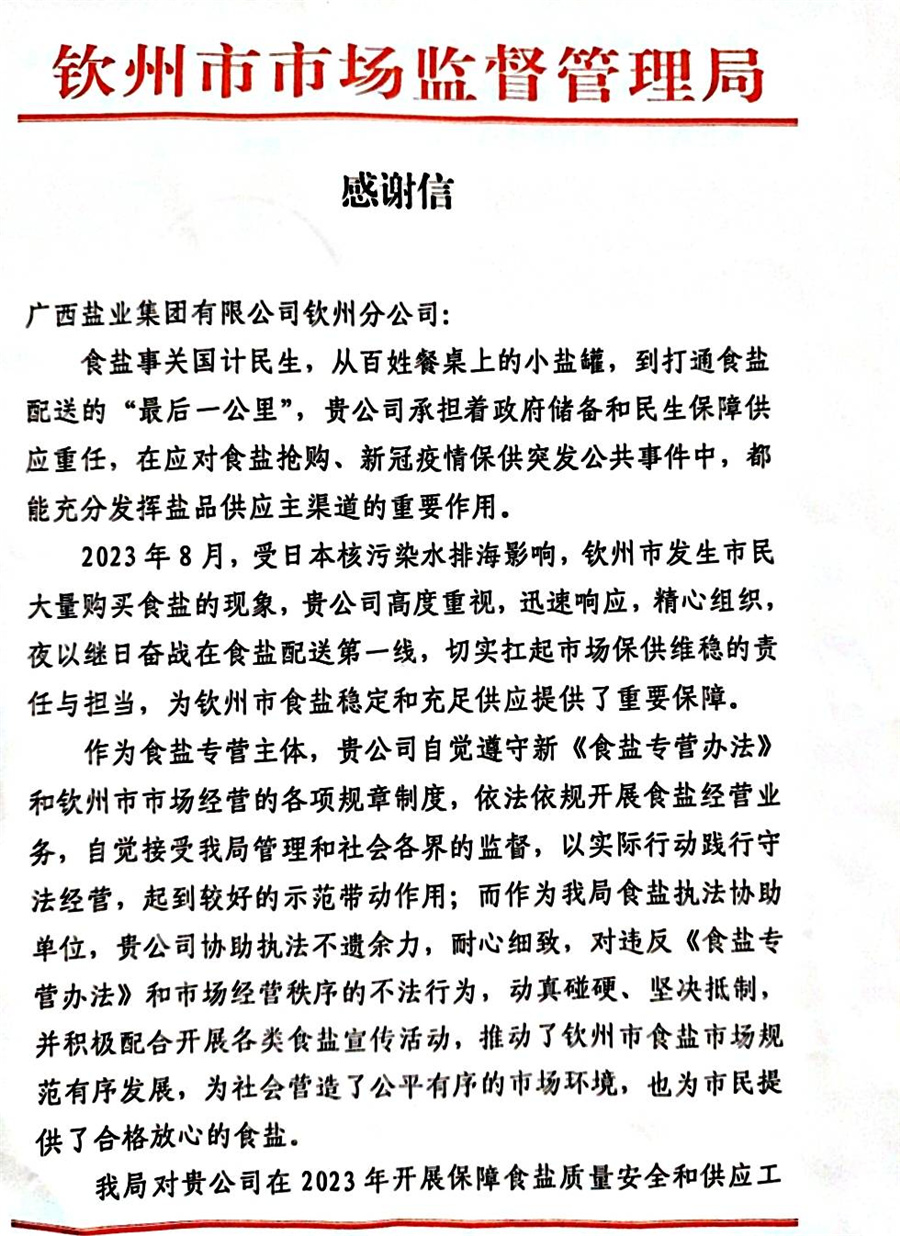 近日,欽州分公司收到欽州市市場(chǎng)監(jiān)管局發(fā)來(lái)的感謝信,信中對(duì)欽州鹽業(yè)分公司履職盡責(zé)、勇于擔(dān)當(dāng)、攻堅(jiān)克難的精神給予了高度贊揚(yáng)。
