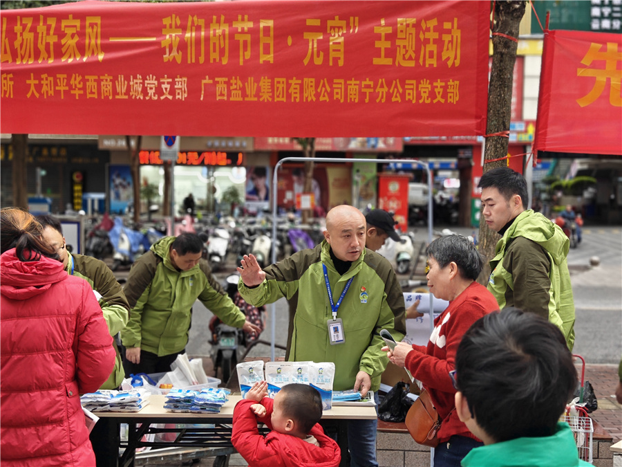 打好“民生牌”,積極踐行社會(huì)責(zé)任。2月23日,南寧分公司加大“地推+走訪(fǎng)”頻次,深入社區(qū)開(kāi)展形式多樣、生動(dòng)鮮活的食鹽科普宣傳活動(dòng),深化“桂山”“桂鹽”品牌推廣。