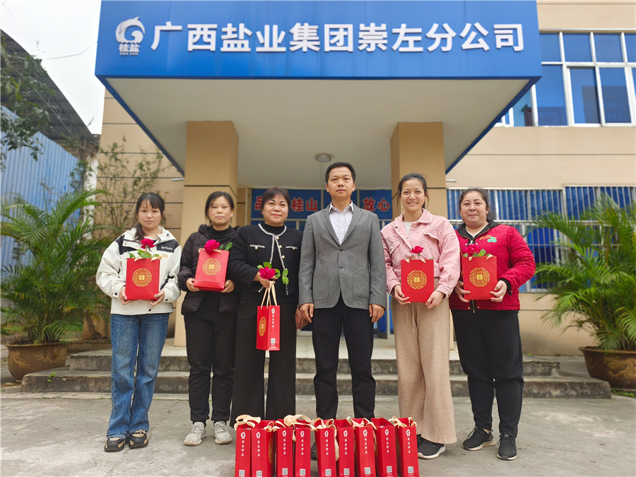 在理工大學的活動中,崇左分公司向廣西理工職業(yè)技術學院女教師致以節(jié)日的問候,女教師們以女性特有的細膩和堅韌,肩負起教書育人的重任,用智慧和愛心點亮了無數(shù)學生的未來。對理工大學重視學校用鹽安全,保障學生身體健康,一直以來使用“桂山、桂鹽”品牌的大力支持表示感謝。在分公司本部,分公司領導為女職工們送上健康鹽品和鮮花,對她們的辛勤勞動表示感謝,并誠摯地祝福女同胞們節(jié)日快樂。