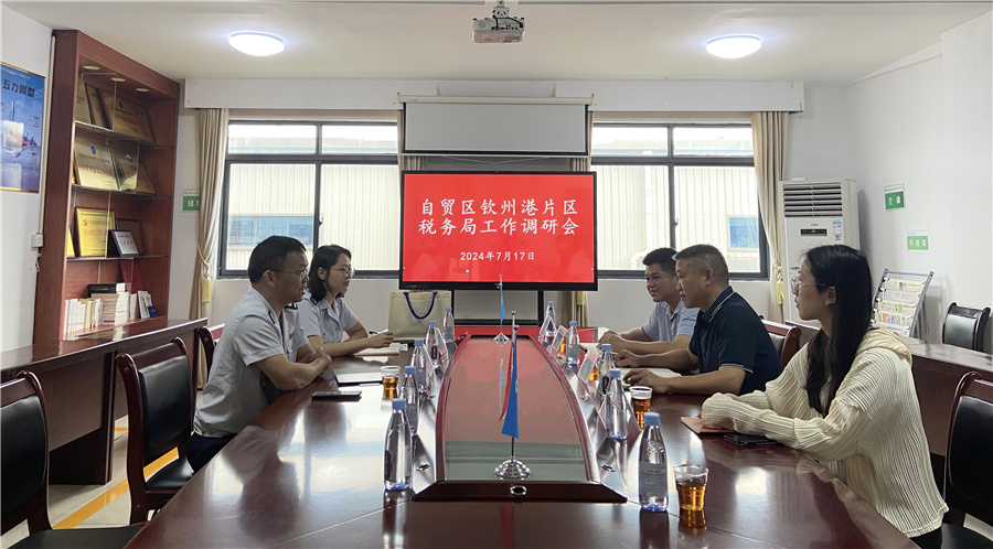 近日,自貿(mào)試驗區(qū)欽州港片區(qū)稅務(wù)局黨委委員、總經(jīng)濟師周如宇一行到銀鵬公司開展走訪調(diào)研。