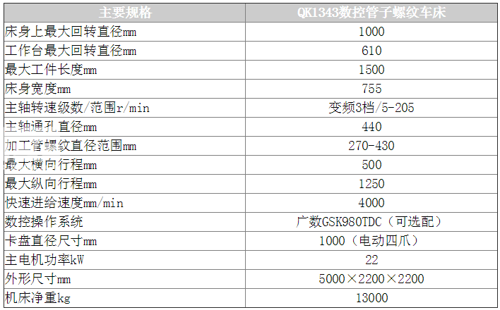 QK1343型數(shù)控管螺紋車床是針對石油、化工、冶金行業(yè)輸油管、鉆桿、套管的螺紋加工要求專業(yè)化設(shè)計(jì)制造。機(jī)床采用雙卡盤夾緊方式,數(shù)控系統(tǒng)自動(dòng)控制,可******加工各種內(nèi)、外螺紋,并具有普通數(shù)控車床的功能