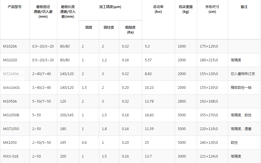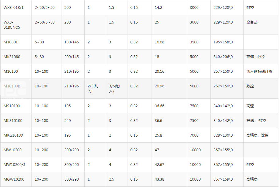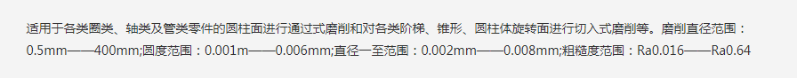 無心磨床:適用于各類圈類、軸類及管類零件的圓柱面進行通過式磨削和對各類階梯、錐形、圓柱體旋轉(zhuǎn)面進行切入式磨削等。磨削直徑范圍:0.5mm——400mm;圓度范圍:0.001m——0.006mm;直徑一至范圍:0.002mm——0.008mm;粗糙度范圍:Ra0.016——Ra0.64