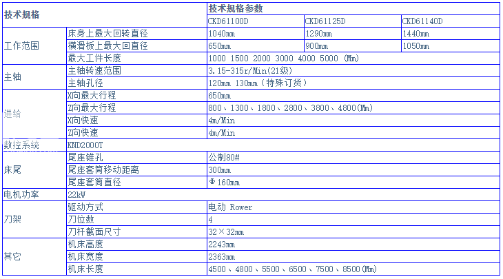 CKD611XXD系列型數控車床是本廠自行研制開發(fā)的數控車床,為大規(guī)格數控車床產品中的精品。高效率、高穩(wěn)定性、高精度、高通用性、高剛性等一系列機床優(yōu)良品質均體現在CKD611XXD系列數控機床的設計和制造中。床身采用平-V導軌,經過中頻淬火和精密磨削,剛性高,可承受重載精密切削。機床配置KND2000T控制系統(tǒng)和伺服進給電機,功能完善,性能可靠。選用國內******滾珠絲杠,精度好,效率高。