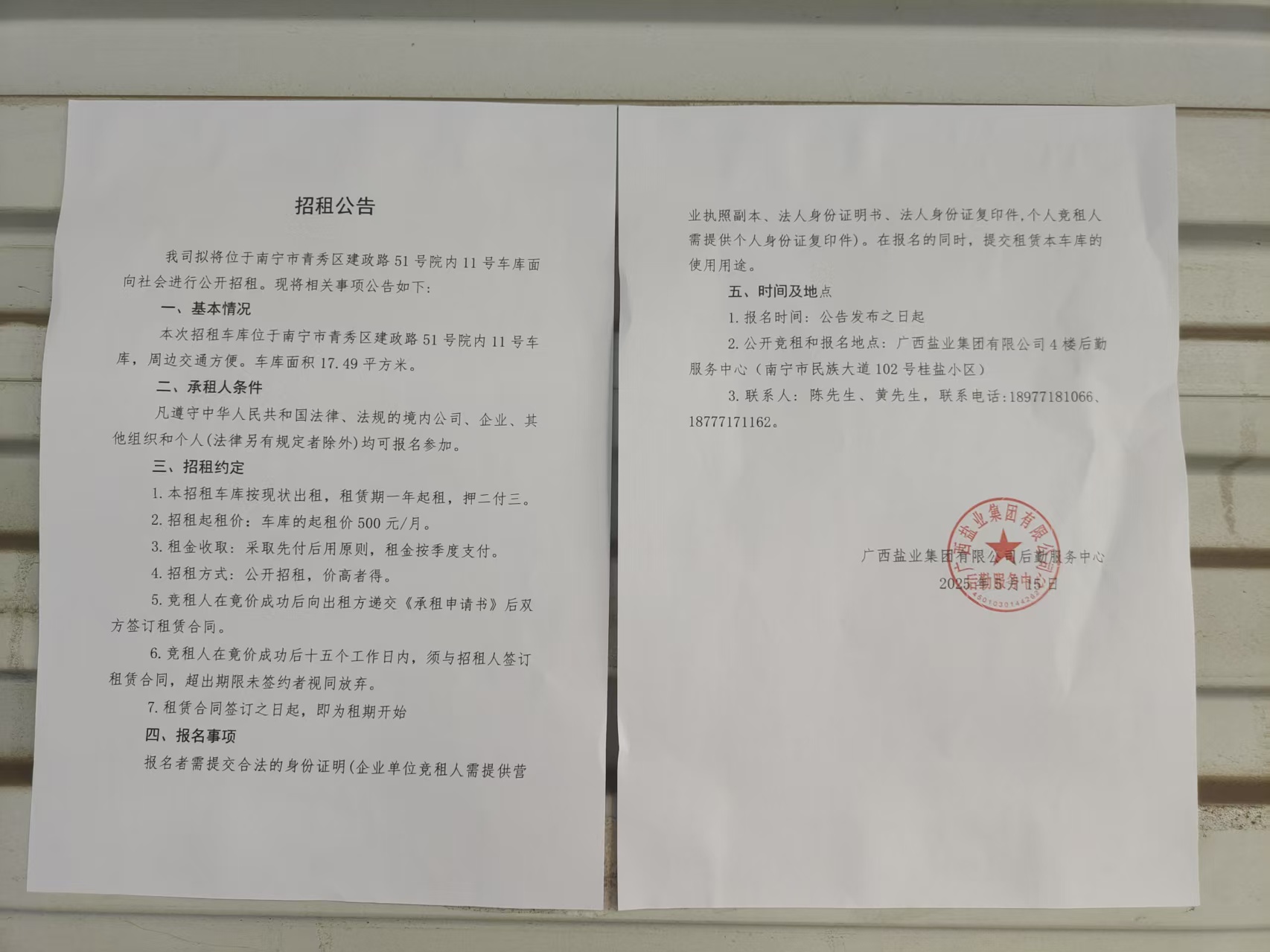 我司擬將位于南寧市青秀區(qū)建政路51號院內(nèi)11號車庫面向社會進行公開招租。現(xiàn)將相關(guān)事項公告如下: